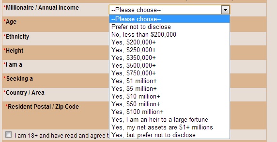 One of the strangest things about this website is that the rich person has to verify their income, and you pick your income from a drop-down menu, before it gets verified. There's a screenshot of the menu below - my favourite option being the "Yes, I am the heir to a large fortune".